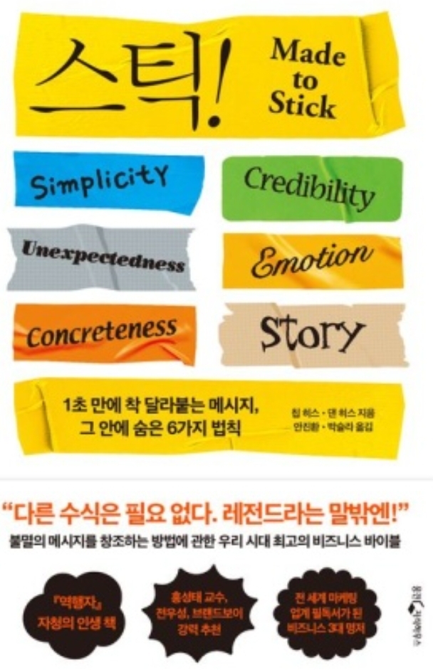누구나 메세지를 효과적으로 전달하고 싶어 한다. 회사 사장님들은 자신의 경영전략을 직원들에게 잘 전달하고 싶어 할 것이고, 선생님들은 학생들에게 가르쳐주는 내용이 머릿속에 착 달라붙기를 원한다. 그리고 광고 담당자들은 상품에 대해 전달하고자 하는 바가 대중의 뇌리에 각인되기를 바란다. 이렇게 만들기 위한 효과적인 메세지를 Stick 메세지라고 하며, Stick 메세지를 만들기 위한 대 원칙을 Success라고 한다. 이런 얘기들이 보통 그렇지만 Simplicity(단순성), Unexpectedness(의외성), Concreteness(구체성), Credibility(신뢰성), Emotion(감성), Story(이야기) 의 Succes에 복수를 의미하는 s를 붙여서 Success 원칙이다. 문장으로 표현하면 간단하고 기발하며 구체적이고 진실되며 감정을 불러일으키는 스토리 라고 책에서 말하고 있다.
