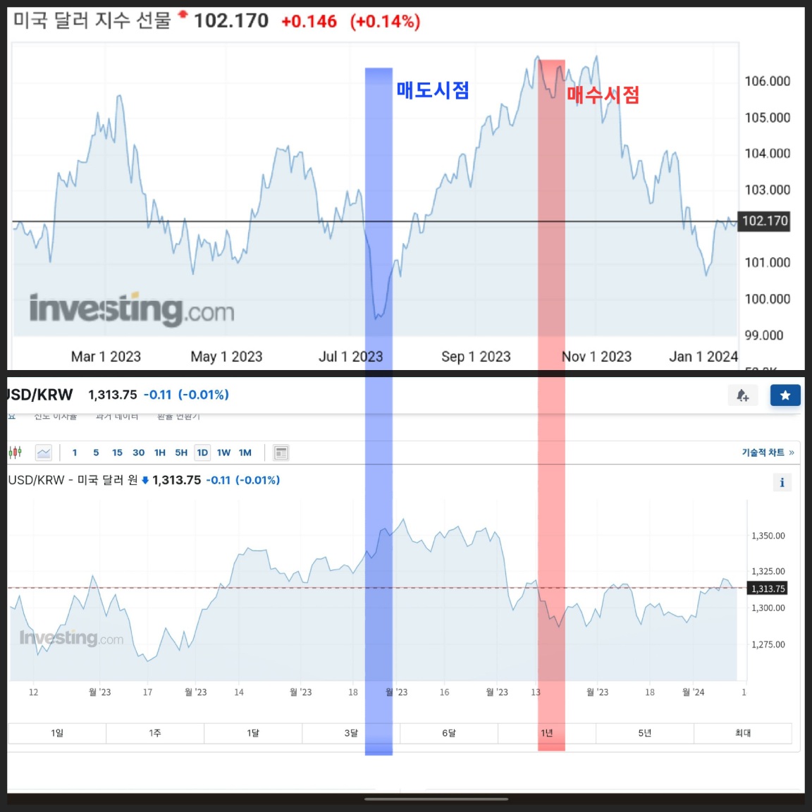 투자의 기본은 가치가 높은 물건을 저렴하게 사는 것이기 때문이다. 달러지수가 높다는 것은 달러의 가치가 높다는 것을 의미하고, 원/달러 환율이 낮다는 것은 달러의 가격이 저렴해졌다는 것을 의미한다. 위 그림의 상황으로 보면 빨간색으로 표시한 부분이 달러 지수는 높지만 원/달러 환율은 낮아진 상태로 매수하기 좋은 상태이며, 파란색으로 표시한 부분은 달러지수는 낮지만 원/달러 환율은 높아진 상태로 매도하기에 좋은 지점이다. 물론 이 내용은 어디까지나 이 글을 적는 제 기준이므로, 투자에 대한 판단은 개인 책임하에 하셔야 한다.