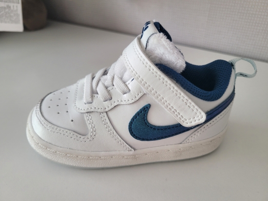 저희 아기가 신고 있는 신발은 위에 언급했던 코트버로우 흰파입니다. 신발 밑창은 고무로 되어 있어 미끄러지기 쉬운 대리석 재질의 바닥에서도 안전합니다. 신발 혀에는 강아지 발바닥 모양이 그려져 있고 보송보송한 털로 되어 있어서 더욱 귀엽습니다. 신발혀의 털은 따뜻한 느낌을 줘서 겨울에도 잘 신겼고, 파란색 나이키 스우쉬가 시원한 느낌을 줘서 봄이 되었어도 답답해 보이지 않습니다. 남자아이라면 파란색 계통 옷이 많으니 깔맞춤 하여 신기기에도 좋은 색상입니다.
