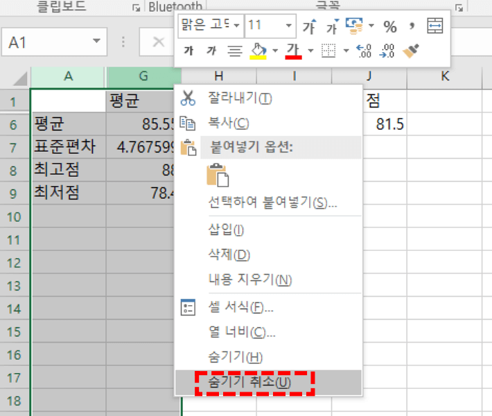 숨기기를 했으면 숨기기 취소도 있어야 합니다. 무작정 감춰 놓고 다시 볼 수 없으면 안 됩니다. 숨기기 취소는 역시 숨기기와 비슷하게 할 수 있습니다. 숨겨진 행 또는 열을 우클릭해서 드래그하면 됩니다. 앞 서 열 숨기기를 하고 나서 열 번호 A, B, C, D, E, F, G가 A || G로 바뀌었다고 말씀드렸습니다. 이 A || G에 있는 A와 G를 드래그해 두시면 숨겨진 열들이 드래그되어 선택됩니다. 그리고 || 표시 위에서 마우스 우클릭을 합니다. 여기까지 하면 위 그림과 같이 표시되는데요 여기서 빨간 박스로 활성화해 둔 숨기기 취소 버튼을 누르면 숨기기 취소가 됩니다. 마우스 우클릭 후 단축키 U를 눌러도 되고, 마우스 우클릭 없이 Ctrl + Shift + 0을 눌러도 됩니다. 열 숨기기 단축키인 Ctrl + 0에 Shift를 함께 누르는 것입니다.