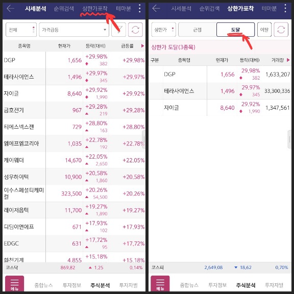 주식 분석으로 들어가면 아래 그림의 왼쪽과 같이 시세 분석으로 들어갑니다. 물론 시세 분석에서도 당일 등락률이 높은 종목들이 나오기 때문에 상한가 종목을 확인할 수 있습니다. 하지만 정확히 상한가에 도달한 종목들만 추려서 보기 위해서 맨 위의 메뉴들에서 상한가 포착을 누릅니다. 아래의 오른쪽 그림과 같이 근접, 도달 메뉴를 볼 수 있습니다. 상한가에 이미 도달한 종목들은 '도달'을 눌러보면 되고, 상승세가 강하여 상한가에 도달할 가능성이 높은 종목들은 '근접'에 들어가면 볼 수 있습니다. 상한가에 도달했다가 이탈한 종목들은 '이탈'을 눌러서 보시면 됩니다. 제가 이 글을 작성한 날에 상한가에 도달한 종목은 총 3 종목으로 DGP, 테라사이언스, 자이글로 확인이 되네요.