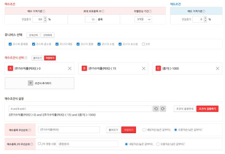 제 기준입니다만 PER이 15 이상이면 너무 높다고 판단하고 있기 때문에 PER 이 낮은 순위로 기업을 뽑더라도 15이상이 되는 경우는 걸리지 않도록 제한 조건을 걸었습니다.