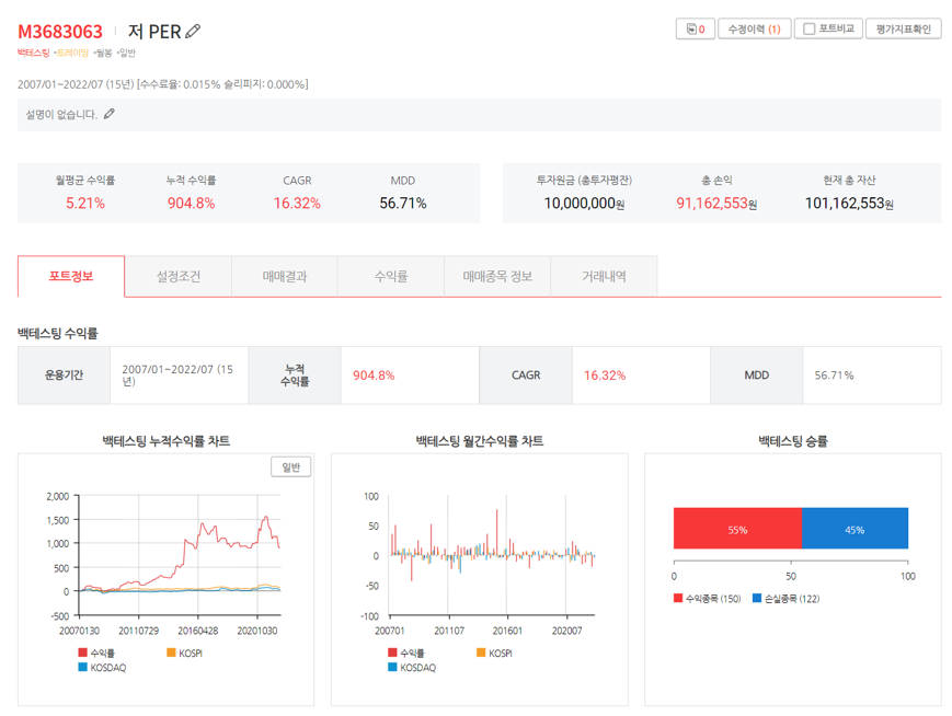 백테스트 결과 입니다. 2007년 1월부터 2022년 7월까지 백테스트했을 때 누적 수익률은 904.8 %, 연 복리 16.32 %를 벌었습니다. 다만 MDD, 최대 낙폭 비율은 56 %로 높은 편입니다. 고점 대비 56%까지 손실을 본 적이 있다는 의미입니다.