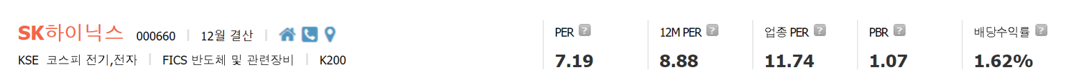 이와 같은 방식으로 삼성전자와 유사한 반도체 메모리 제조업체인 SK하이닉스의 PER을 확인해보면