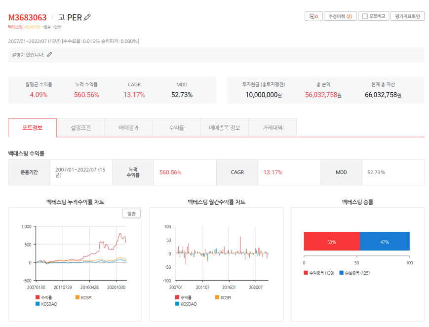 PER이 높은 순서대로 매수한 경우 누적수익률 560% 연복리 13.17%로 나쁘지 않은 결과 입니다만, 앞서 확인한 저PER에 비하면 수익률이 낮아진 것을 확인할 수 있습니다. MDD는 50% 이상으로 비슷한 수준입니다. 고 PER 전략의 경우 보통은 성장주, 테마주들이 포함되게 됩니다. 순이익 대비 주가가 비싸다는 것은 현재 인기가 많아서 고평가 된 주식들이 포함되게 됩니다. 정치상황이나 이슈가 있어서 급등하는 주식들이 포함된다는 의미입니다. 따라서, 고 PER 주식이라고 해서 주가가 비싸다는 이유로 이를 배제하는 선택을 할 필요는 없습니다. 다만, 인기가 많은 주식들을 따라 산다고 해도 저평가되어 있는 저 PER 주식들 대비 높은 수익을 얻지 못했다는 것은 기억해 둘 필요가 있습니다. 이와 같이 백테스트를 통하여 주식의 파라미터들을 하나씩 검증해보는 작업을 해보면 어떤 파라미터들이 어떤 상황에서 유효한지를 배울 수 있게 됩니다. 역시 주식투자를 할 때 가장 중요한 것은 다시 한번 강조하여 백테스트입니다.