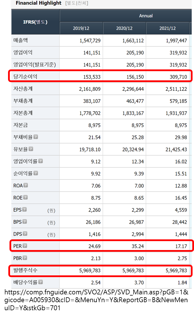 주가는 58100원, 시가총액은 3910334 억원,억 원, 당기 순이익은 309710 억 원, 발행 주식수는 5969783 개입니다. 이를 통하여 한 주당 벌어들이는 이익의 비율을 계산한 PER을 확인하면 3910334/309710 =12.62입니다. 당기순이익이 현재 분기 값이 아니라 공시된 값인 12.74와는 조금 차이가 있는 것으로 보입니다.