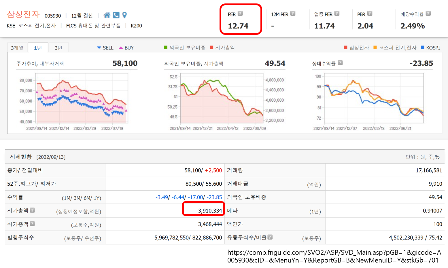 삼성전자의 2022년 9월 14일 재무 정보와 주가 정보를 Fnguide라는 사이트를 통하여 확인해 보았습니다.