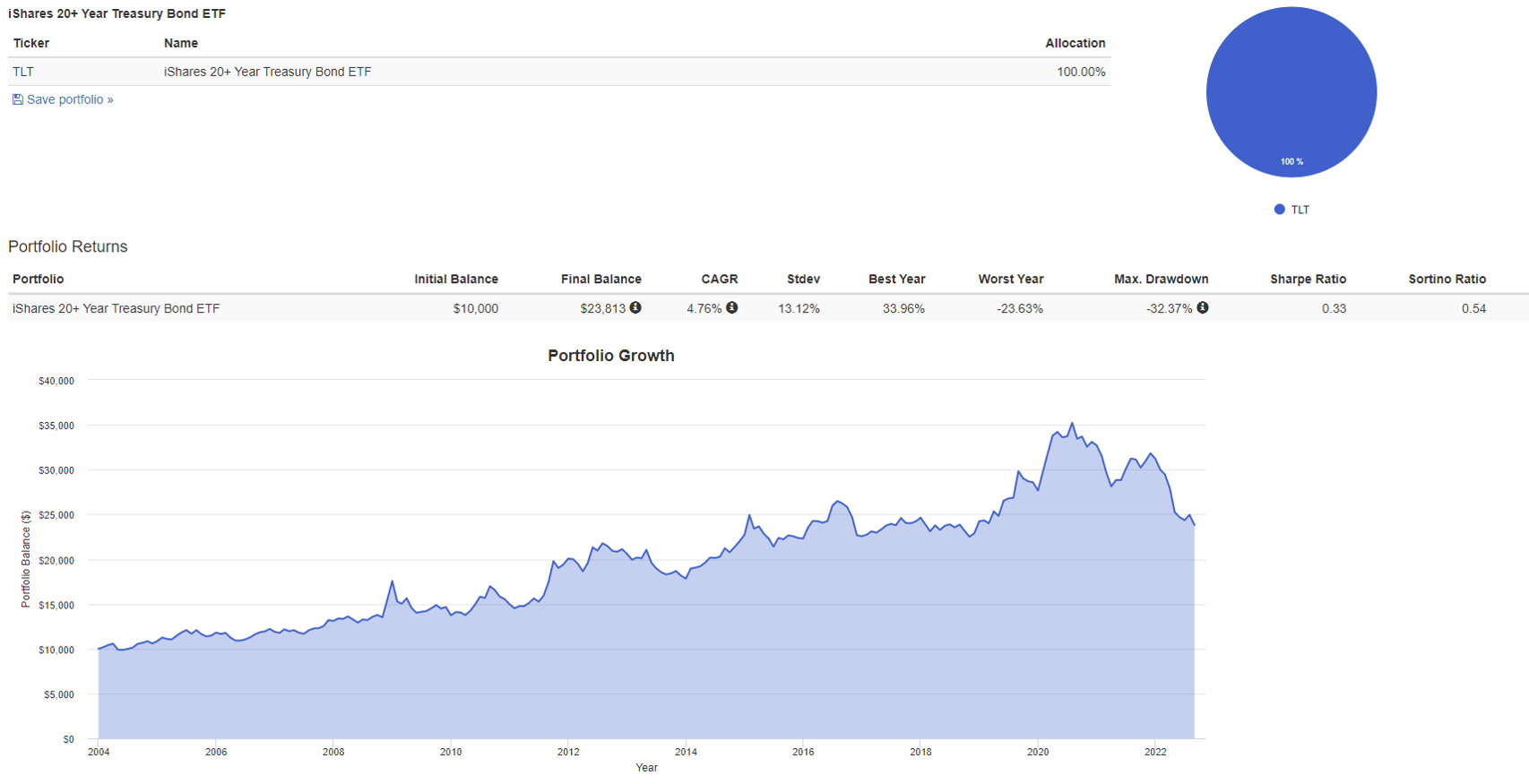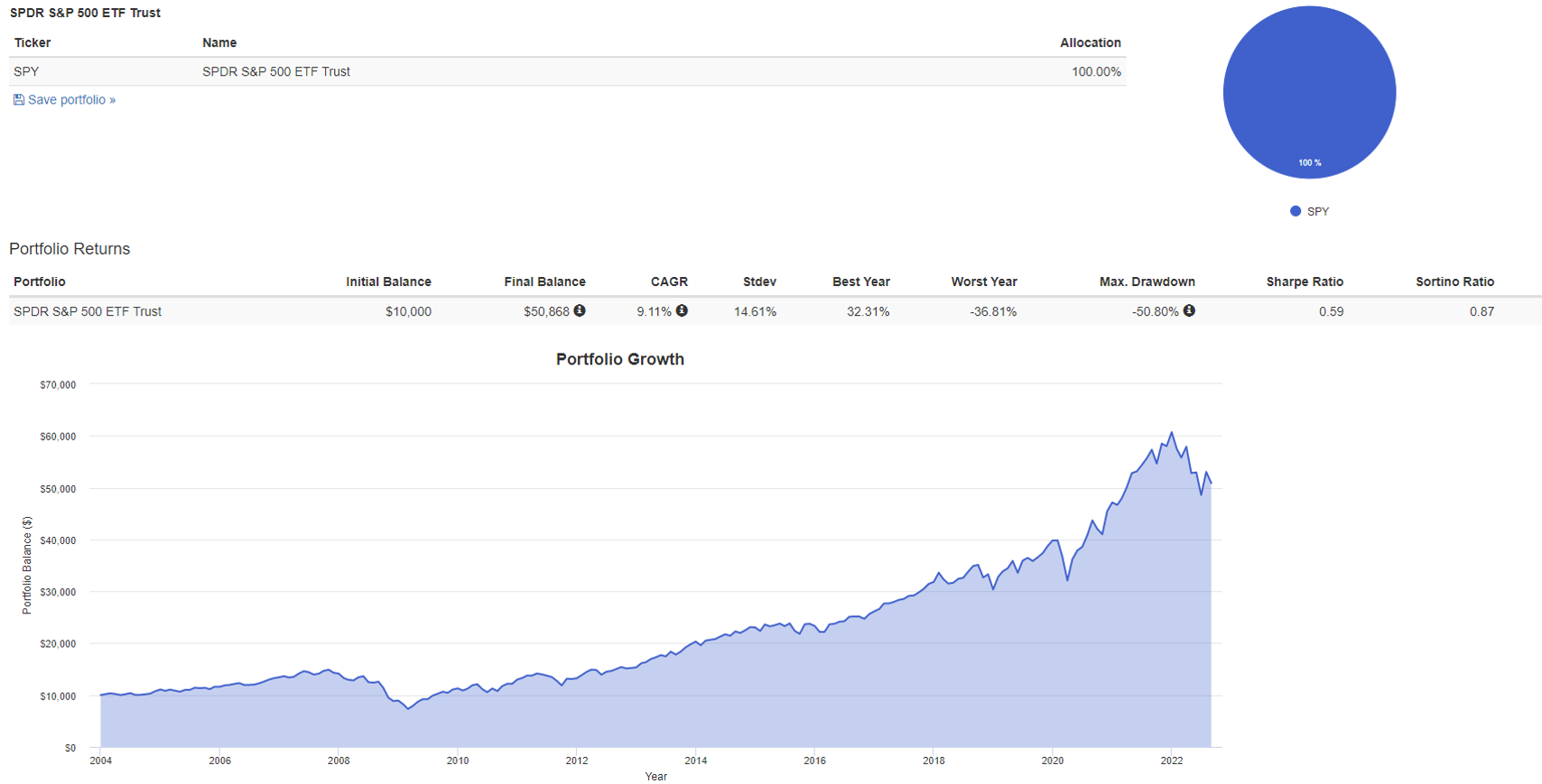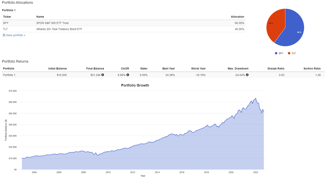 앞서 자산배분에 대하여 알아보았습니다. 이상적인 자산배분을 위해서는 상관관계가 -1인 자산들을 찾으면 됩니다. 하지만 상관관계가 -1인 자산은 실제로 존재하지 않습니다. 실제로는 0에 가까운 수준이면 굉장히 상관관계가 낮은 것이지요, 주식과 채권이 그런 관계 입니다 (2022년 9월 현재시점에서는 연동되어 보입니다.) 다음은 portfolio analyzer라는 사이트에서 미국 S&P500을 추종하는 ETF인 SPY와 미국 장기채를 추종하는 ETF인 TLT를 6:4의 비율로 배분하여 1년마다 보유 비중을 맞춰주는 방식으로 투자한 것입니다.