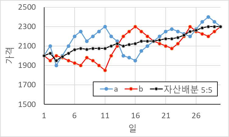 우상향하는 자산인 a와 b를 5:5비율로 맞춰 자산배분 한 결과를 까만선으로 표시하였습니다. a와 b의 등락이 심하지만 5:5 자산배분 시에는 등락이 심하지 않고 완만하게 우상향 하는 것을 볼 수 있습니다.