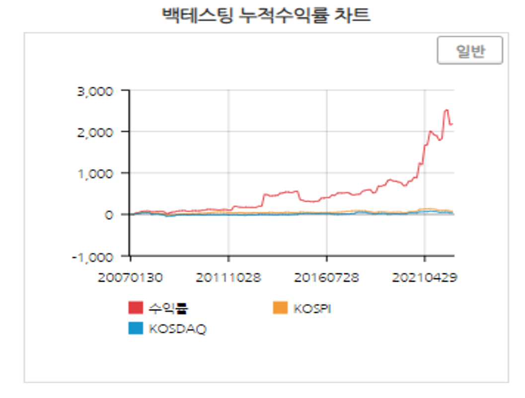 매수 종목 우선순위는 PBR을 오름차순으로 정렬하여 PBR이 낮은 순서로 10 종목을 뽑도록 하였습니다. 3개월 이후 전량 매도 후 다시 PBR이 낮은 순서로 10종목을 뽑아서 구매하는 방식입니다. 이때 매수조건 식으로 PBR이 0 이하인 경우를 제외시켜 순 자산이 0 이하인 기업을 제외했습니다. 또한 D 조건에 PBR 1.5 이하 조건을 걸어서 혹시라도 PBR이 너무 높은 종목이 걸리지 않도록 하였습니다. 종가 기준 1000원 이상으로 동전주를 제외했으며 시가총액은 비율로 0~25% 이내에 들어가는 기업들이 조건 대상입니다. 백테스트는 뉴지스탁을 통하여 진행하였습니다.