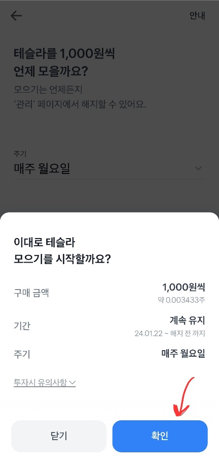 마지막으로 설정이 잘 되었는지 확인하는 창이 나온다. 매주 월요일 해지 전까지 1000원씩 테슬라 주식을 매수하도록 설정이 되었다. 확인을 누르면 앞으로 토스 증권에서 이와 같은 규칙으로 테슬라 주식을 매수하게 된다.