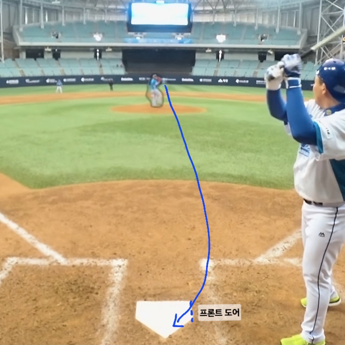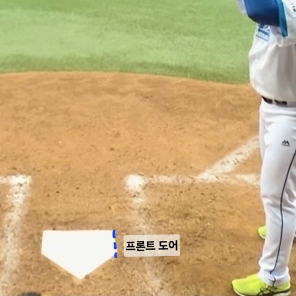 우선 프론트 도어의 위치부터 알아보도록 하겠습니다. 아래 그림을 참고하시면 이해가 쉬우실 것입니다. 프론트 도어는 타자 입장에서 바라본 홈플레이트의 앞쪽 면입니다. 파란색 실선으로 표시해 두었습니다.