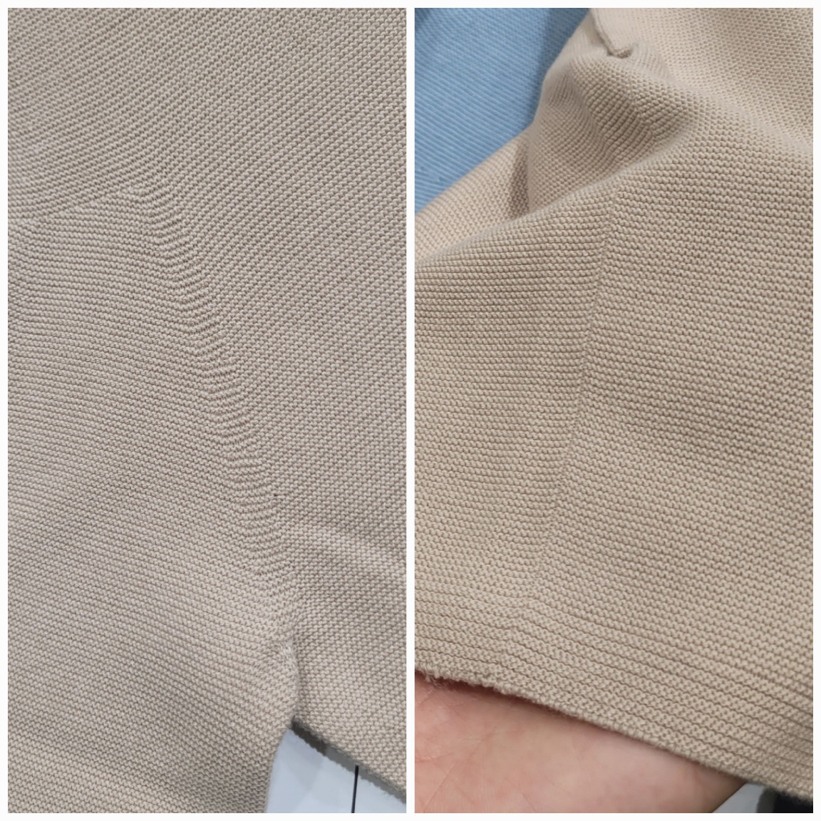 위 그림을 보면 왼쪽은 겨드랑이 부분, 오른쪽 그림은 옆구리 부분의 사진입니다. 특별한 봉제선이 없이 옷이 만들어졌기 때문에 심이 없습니다. 그냥 옷감과 옷감이 붙어있는 형태처럼 만들어진 셈 입니다.